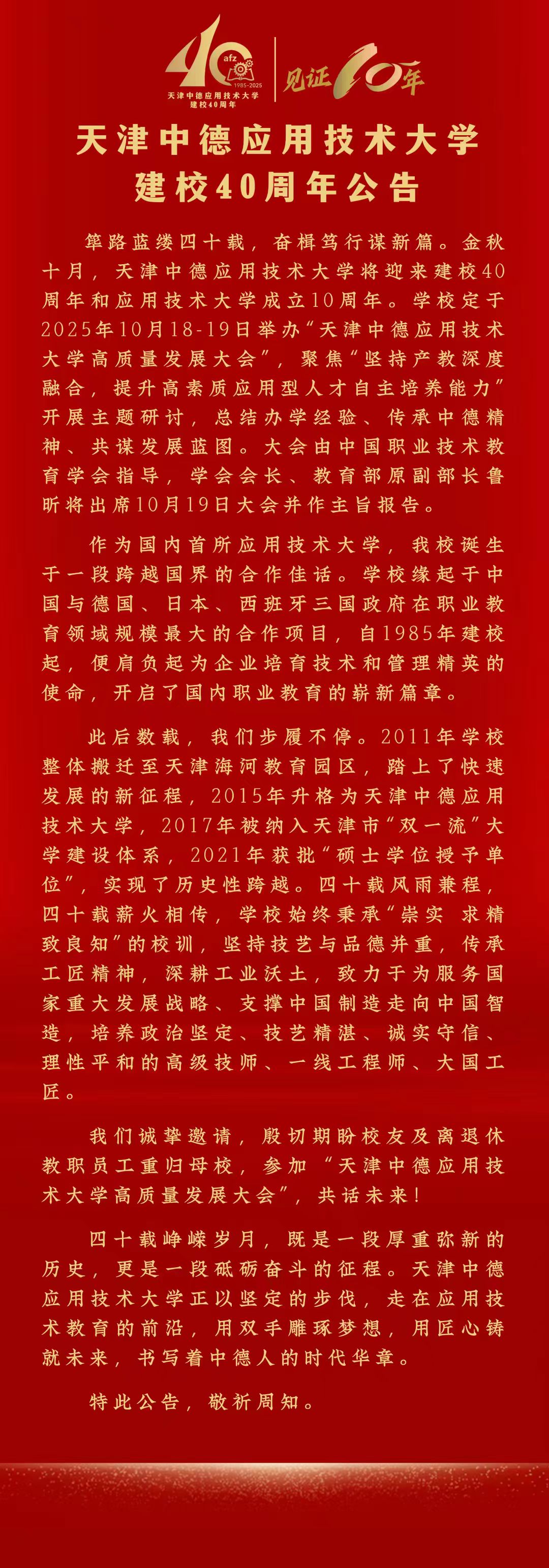 天津中德应用技术大学建校40周年公告